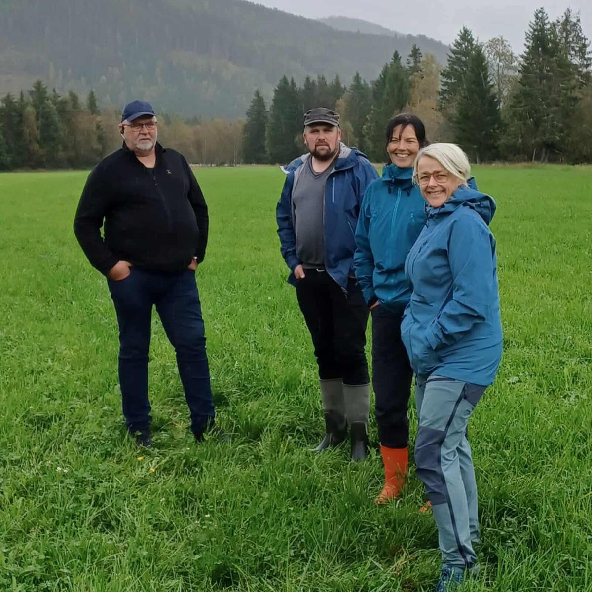 Befaring på innmarksbeitet der rovdyrangrepet foregikk i sommer. F.v. : Jan Ove Lyseggen, Øivind Løken, Turid Backe-Viken og Anja Holmøy Aamold.