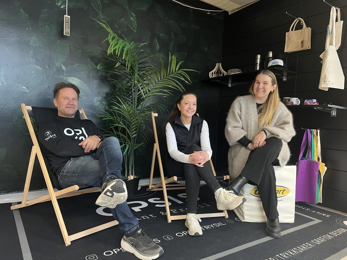 Dagligleder Steinar Eriksson, produksjonsleder Karina Augdal Løkstad og profilerings- og markedsansvarlig Tine Pedersen Olbergsveen i profileringshjørnet i butikken.