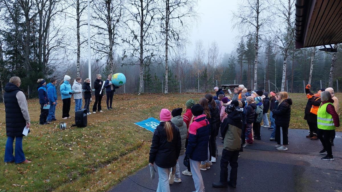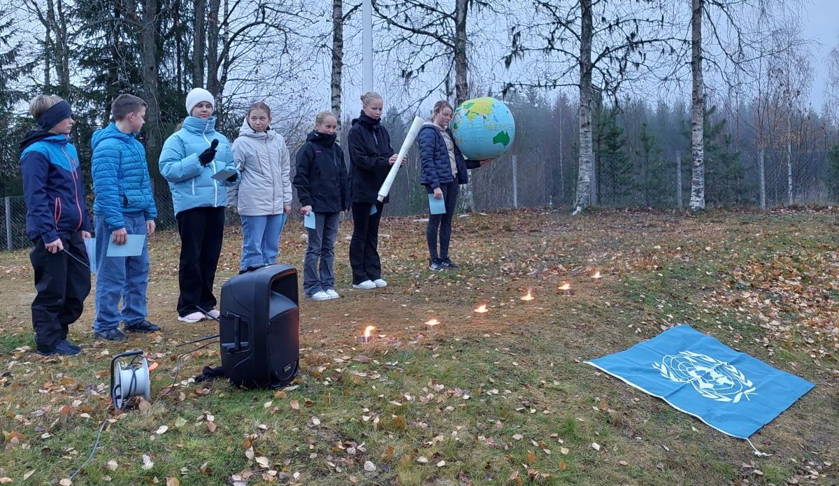 - Hos oss er det tradisjon at 7. klasse har ansvar for en markering ute på morgenen 24. oktober. Elevene informerte oss om FN og viste fram FN-flagget. De tente fakler for barn som ikke har det godt, for fred i verden og annet. Alle var med og sang et vers av Jeg folder mine hender små. Det ble ei fin og trivelig stund ute i halvmørket før vi gikk inn til en ny skoledag, forteller lærer Marianne Lund.