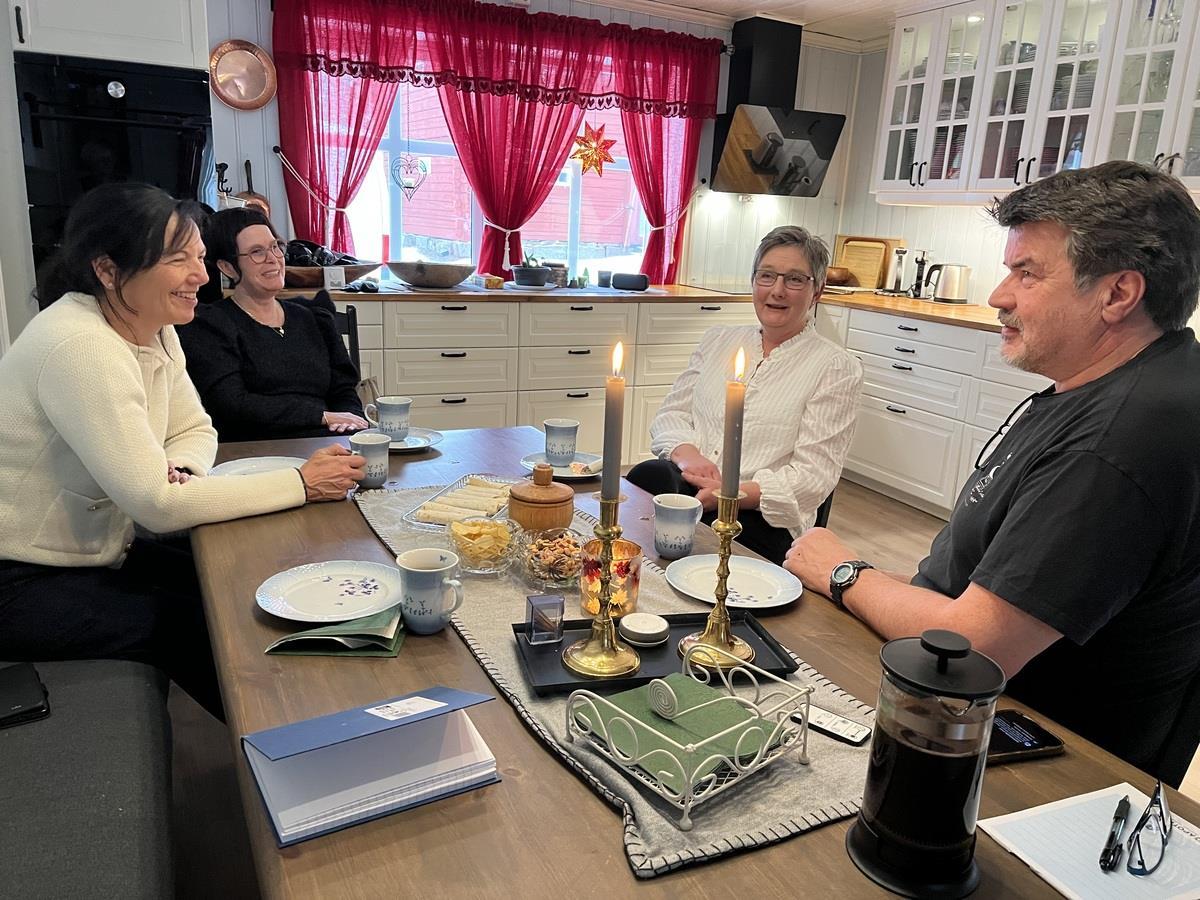 God mottakelse på kjøkkenet i hovedhuset på Nyhuus Østre - Eriks. F.v.: Turid Backe-Viken, Marianne Olsen, May Kirsten Nyhuus og Bjørn Arild Storsveen.