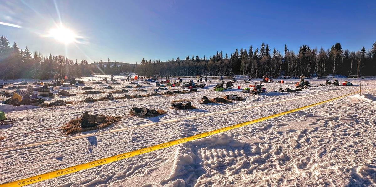 Fra kaféen er det en kort spasertur til hundearenaen. Her får du se hundene hvile, spise og bli sjekket av veterinærer, mens hundekjørerne steller hundene og sørger for mat og vann.