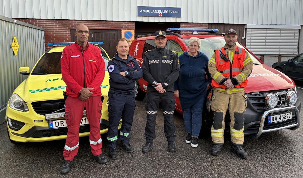 På bildet er nødetatene representert ved Lars Wold og Per Morten Ropphaugen i prehospitale tjenester i Sykehuset Innlandet (ambulansen), Thomas André Hansen fra Innlandet politidistrikt, enhetsleder i enhet for legesenter og beredskap Ann-Karin Røgholt og Ole Petter Blestad i Midt-Hedmark brann- og redningsvesen IKS.